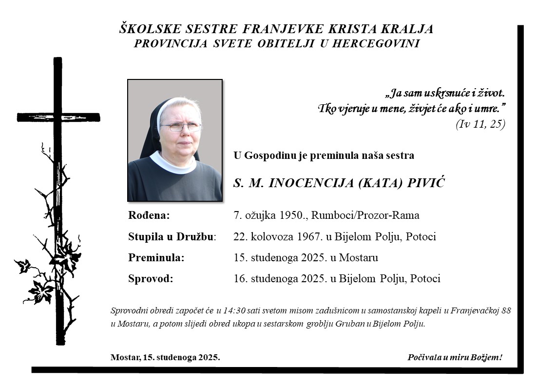 Dana 15. studenoga 2025. godine, u samostanu Svete Obitelji u Mostaru, u Gospodinu je preminula naša s. Inocencija Pivić.